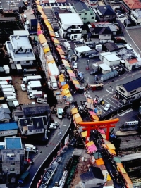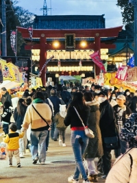 現在の「椿まつり」は、全長1.5kmの「椿参道」に露店がずらりと並び、3日間の開催期間中に40万人を超えるひとが訪れる大規模なお祭りです。初日、午前0時に大太鼓が打ち鳴らされ、そこから最終日の深夜24時まで、実に72時間、昼夜を徹して祭りが続きます。