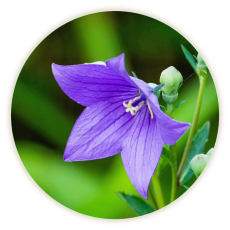 キキョウ科キキョウ属。紫または白の美しい花。漢方では太い根を干して咳や咽喉の薬に。薬用成分サポニンを含有し、昆虫による食害から自らを守ります。かつて漢名で「キチコウ」と読みました。『万葉集』などに登場する「朝顔」は桔梗のことだと考えられています。