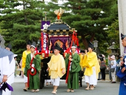 1日の「神幸祭」では、御祭神の「御霊(みたま)」を御鳳輦(ごほうれん)にて本社より西ノ京の御旅所にお遷します。2・3日目は御旅所にて「八乙女舞(やおとめまい)」の奉納や「献茶祭」などを斎行。4日の「還幸祭」で本社に戻ります。