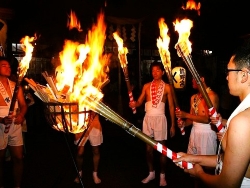 7台の太鼓台はそれぞれ300個余の提灯を鈴なりに飾り、いただいた御神火を提灯に移し、威勢のいい若連の掛け声とお囃子を奏しながら、市内を勇壮に練り歩きます。