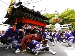 日曜日の「本祭り」では、例大祭のもっとも重要な行事「神輿渡御」が行なわれます。月曜日の「後祭り」では、4町と3町のふた手に分かれて「合同引き廻し」が行なわれます。