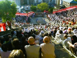 会場は市内4ヶ所で、筆頭の諏訪神社前の踊場には、桟敷席のほか、神社大門下の73段の石段坂「長坂(ながさか)」も観客席になります。踊場を正面に見る特等席の「長坂」は、「坂の町長崎」の象徴です。桟敷席と「長坂」が2500人もの観衆で埋め尽くされ、華麗な演し物に「モッテコーイ!」の声が掛かると、祭りの熱気は最高潮に達します。