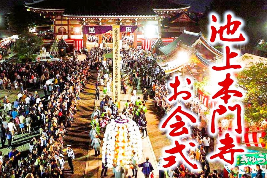 「万灯」は、日蓮聖人が亡くなったとき、庭先の桜(お会式桜)が時ならぬ花を咲かせたという故事に由来します。紙で作った造花で「お会式桜」を模し、灯明輝く宝塔を飾ります。例年、午前0時頃まで、百数十基の万灯が、池上徳持会館から本門寺までの約2kmにわたり総勢約3千人で練り歩きます。参詣者はひと晩で30万人を超えるといいます。