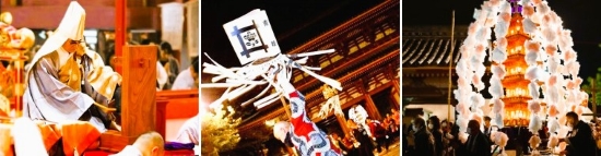 午後6時頃、「万灯練供養(まんどうねりくよう)」 全国各地の万燈講中の人びとが「纏(まとい)」を振り、「提灯」をかざし、「団扇太鼓(うちわだいこ)」を叩いて、「万灯(まんどう)」をかかげます。