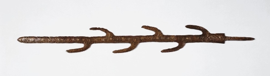 石上神宮の神庫(ほくら)で御神体同様に守られてきた国宝「七支刀(しちしとう)」は鉄製の剣で、その特異なかたちでよく知られています。剣身の棟には表裏合わせて60余字の銘文が金象嵌(きんぞうがん)で記されていて、明治時代から解読が続けられていました。