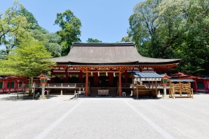 「拝殿」は、白河天皇が「鎮魂祭(ちんこんさい)」のため永保元年(1081)に宮中の「神嘉殿(しんかでん)」を寄進したものと伝わります。鎌倉時代初期の建立と考えられ、現存する最古の拝殿であり、国宝に指定されています。