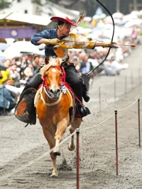 神事「流鏑馬」では、表参道下から東照宮に向かって馬を駆り、一気に駆け抜けながら的を射ます。小笠原流の妙技と弓さばきが見事で、人馬一体となって疾走する光景は大迫力の見ごたえです。