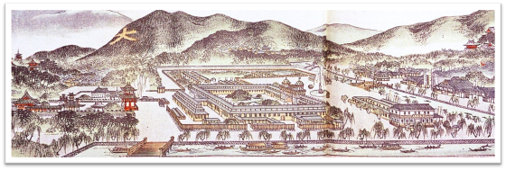 さらに、最も都に適う場所として、延暦12年(793)葛野郡(かどのぐん)と愛宕郡(おたぎぐん)を選び、都の造営を開始しました。翌13年(794)10月22日、新しい都に移った桓武天皇は、ここを「平安京」と称し、延暦15年(796)「大極殿(だいごくでん)」にて「百官の拝賀(ひゃっかんのはいが)」を受けました。