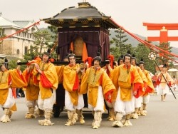 先頭の名誉奉行は「京都府知事」「京都市長」が務めます。そして、明治維新期の西洋兵式教練の鼓笛隊「維新勤王隊列(いしんきんのうたいれつ)」から始まり、ついで、江戸、安土桃山、室町、吉野、鎌倉、藤原、延暦と時代を遡っていきます。最後に、「御賢木(おんさかき)」に先導された「神幸列」が巡行します。前の「御鳳輦(ごほうれん)」が「孝明天皇」、後の御鳳輦が「桓武天皇」です。「神幸列」は、お祭りの本来の主役で、最も重要な意義を持ちます。